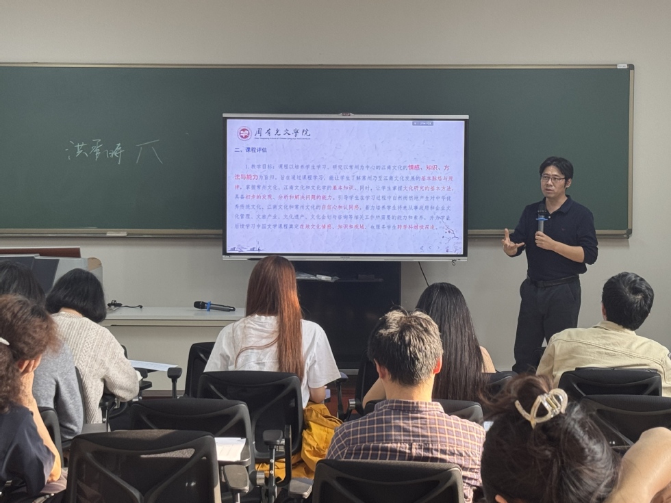 为深化课程思政建设,提升教师育人实效,4月23日下午,周有光文学院举办“汉语言文学课程思政评价体系建设实践与课程评估经验工作坊”。学院党总支书记焦洁庆、院长葛金华、副院长陈鸿、院长助理董文康、专业负责人靳瑞芳、中文系主任贺与诤出席活动,全体教师参加活动。工作坊由贺与诤主持。