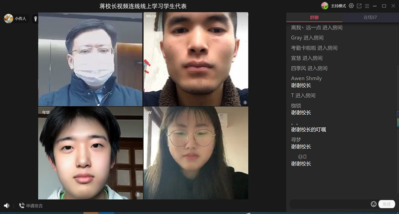蒋军成通过课程QQ群视频连线学生代表,亲切问候了即将上课的学生并提出殷切希望,一是认真按照学校统一部署,根据课程计划保质保量完成线上教学课程的学习任务,停课不停学,提高学习成效;二是深入掌握线上教学主渠道——云中课堂的特点,尽快适应新的教学方式,同时不断强化自律意识,做好云中课堂的学习;三是积极参与云中课堂的完善与创新,共同推进线上教学质量的提升。他还希望,同学们在疫情防控期间,严格按照学校统一指挥和要求,注意自身身体健康,规范化做好个人防护工作。