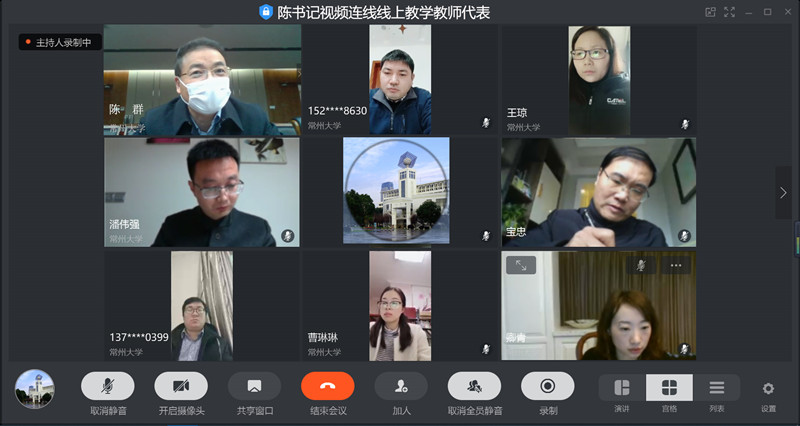 陈群通过钉钉会议视频连线线上教学教师代表,对在疫情防控期间辛苦奋战,保障线上教学工作正常开展的教师们表示慰问和感谢。为推进疫情防控期间教育教学工作有序、有质量的进行,他要求广大教师,一是深入掌握线上教学方法,灵活熟练运用线上教学的各种形式及工具,保障线上教学有序进行;二是深度认识线上教学面临的挑战,不断钻研教学方法,加强学生自我学习和自我监控能力的培养,切实提高学生学习积极性;三是深化OBE教学理念,强化线上教学质量保障,通过加强质量监测和控制,及时调整教学策略,切实提升教育教学质量;四是深化课程思政,将战“疫”事例作为大学生理想信念教育素材,用抗“疫”实例诠释关于生命的责任感,坚定广大学生爱党、爱国、爱社会主义的信仰。